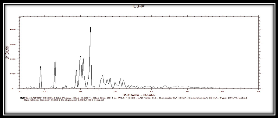 The SD was studied for prediction of crystallinity. The PXRD Pattern of PGZ is shown in fig. 21. Based on the diffractogram it can be suggested that PGZ is present in its amorphous form since it exhibits several well-defined peaks at a diffractogram angle of 2θ. The strong peak at 2θ of 22.762 was a highly intense peak with 100% intensity indicating the presence of amorphous PGZ.