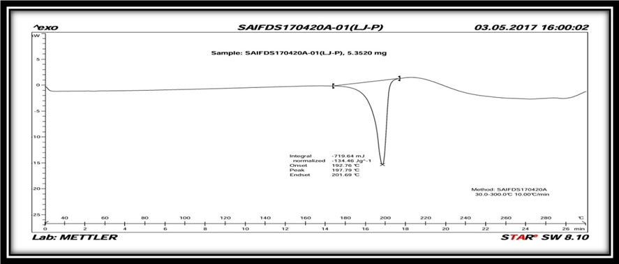 Differential scanning calorimetry studies were carried out in order to evaluate the ability of the polymer to stabilize amorphous form of the drug in SD. DSC thermograph of PGZ is shown in fig. 23 which shows melting endotherm at 197.790 c i.e. melting point and the amorphous state of the drug.