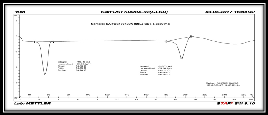DSC thermograph of PGZ: PLX 188 (MW) is shown in fig. 24 indicating the formation of stable crystalline SD investigated by a decline in melting endotherm of PLX 188 from 50.830 c to 60.780 c and increase in melting endotherm of PGZ from 189.710 c to 202.620 c.