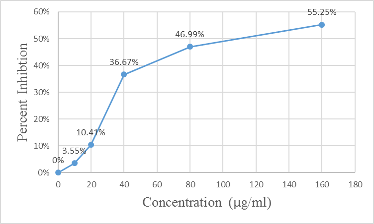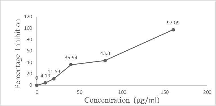 Sodium nitroprusside (5 mmol) in phosphate buffer saline was mixed with different concentrations of ethanolic extract (10-320 µg/ml) dissolved in DMSO and incubated at 25 ͦC for 30 min. After 30 min, 1.5 ml incubated solution was removed and diluted with 1.5 ml of Griess reagent (1% suphanilamide, 2% orthophosphoric acid and 0.1% napthylethylene diamine dihydrocholride). The absorbance of the chromophore formed during diazotization of the nitride with sulphanilamide and subsequent coupling with napthyethylene diamine was measured at 546 nm along with a control [13]. The percentage inhibition of nitric oxide generated was measured by comparing the absorbance values of control and test samples using following formula.