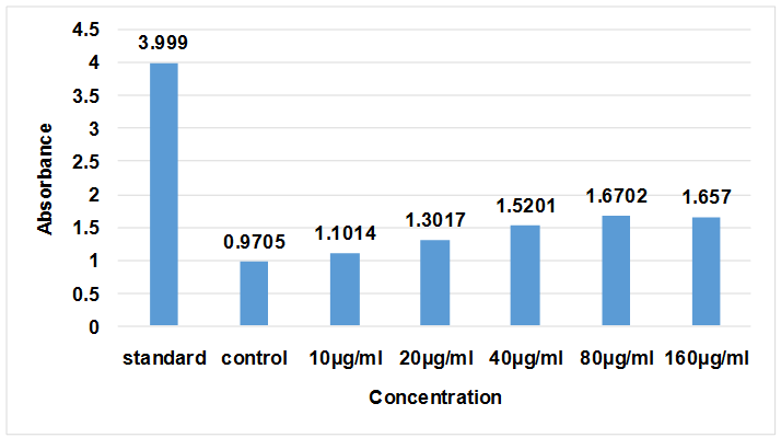 The extract exhibited concentration dependent increase in absorbance. Absorbance indicated by all the concentrations of extract was significantly higher than the absorbance of control reaction (0.9705). Higher absorbance indicates high reducing power due to formation of reduced intermediates. Ascorbic acid has much high reducing ability than the ethanolic extract of Parthenium hysterophorus Linn.
