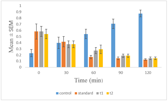 | Test T2 | 100 mg/kg | 0.5417±0.07683 | 0.375± 0.0559* |