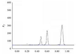 HPTLC precoated plate, silica gel 60 F254, 10 X 10 cm2, thickness 250 μm were used. Samples were injected using Linomat injector. Methanol: Ethyl acetate (2:8) was used as mobile phase. 1% Cerric ammonium sulphate was used as spraying reagent. Relative humidity and temperature were 52% and 24 °C respectively. The 80 mm migration distance was allowed for 30 min. Densitometric scanning was performed using UV detector at 254 nm. Ascending separation technique was used in twin-trough glass chamber (10 X 10 cm2) which was used as development chamber; saturation of chamber was done prior to development.