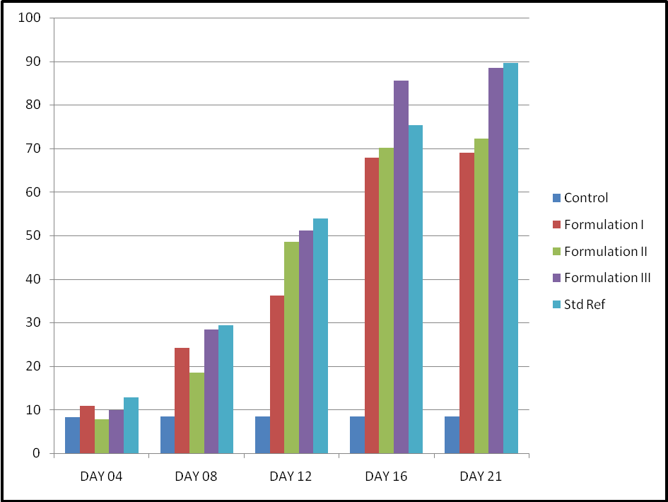 From the above remarks, it can be concluded that all the parameters of the selected herbs were within in the Pharmacopoeial limit indicates the high-quality quality of raw materials. The extract studies showed the presence of selected active constituents in significant amount. The microbiological studies indicated that the formulations possess anti-microbial activity against tested organisms. The wound contraction studies revealed that the wound contraction increases on increasing the concentration of herbal extract. The study also reveal that the better activity of polyherbal formulation may be due to the synergistic action of the plants constituents present in the formulation. Thus, the prepared topical gels possess a versatile approach in healing the wound contraction.