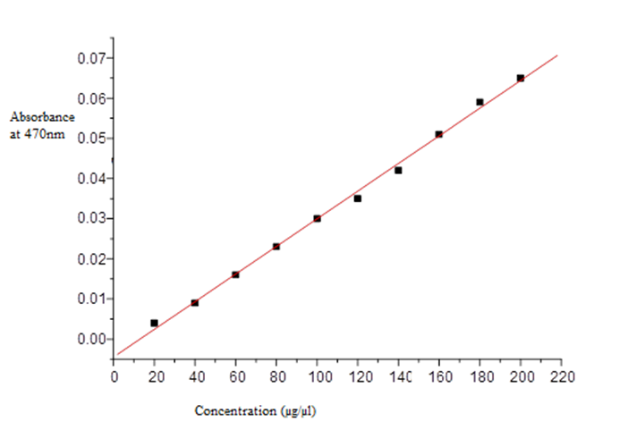 A standard calibration plot was generated at 470 nm using known concentrations of atropine. The concentrations of alkaloids in the test samples were calculated from the calibration plot and expressed as atropine equivalent of alkaloid/g of sample.