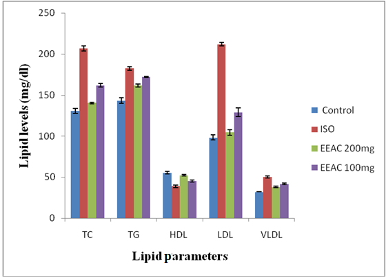 The significant (p<0.01) increase in the levels of total cholesterol, triglycerides, LDL-cholesterol, VLDL-cholesterol and a significant decrease in the levels of HDL-cholesterol in the plasma of isoproterenol-treated rats was observed when compared with normal control-treated rats. Pretreatment at the dose of 200 and 100 mg/kg with ethanolic extract of Allium cepa aerial leaves significantly reduced (p<0.01) the levels of total cholesterol, triglycerides, LDL-cholesterol, VLDL-cholesterol and significantly increased the levels of HDL-cholesterol when compared with isoproterenol-treated rats.