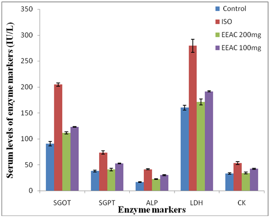 Fig. 2: Effect of Administration ethanolic extract of Allium cepa aerial leaves on isoproterenol-induced alterations in serum levels of marker enzymes in rats, values expressed as mean±SEM for six animals in each group