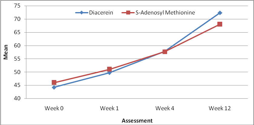 The mean values and the statistics for the efficacy parameters are presented in table 2. The pain was assessed using Lysholm knee scoring scale. An increase in the Lysholm knee score indicates the reduction in pain level experienced by the patients. Subjects were assessed for pain at baseline, 1st week, a 4th-week and12th week. The mean pain score was found to increase to a similar extent in both the groups during the 12 w treatment period: from a mean value of 44. 2+/-6. 6 at baseline to 72 4+/-6.8 at week 12 in the diacerein group and from 46+/-6.6 at baseline to 68. 02+/-6.8 at week 12 in SAM group. The above mean values were compared and the significant p-value reveals that the pain level differs week wise. A reduction in the pain level in both groups was observed to be maximal at the end of the 12th week. To analyze which of the two drugs is more effective, 2