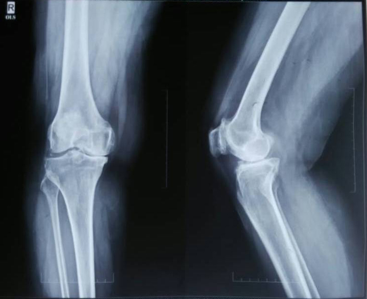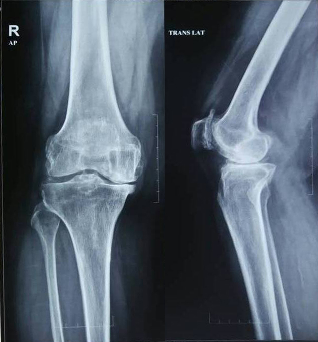 The presences of symptomatic disease with pain present most days or crepitus on the motion. Two–view radiographs of the affected knee was obtained showing radiographic evidence of OA knee with a reduction in joint space and presence of osteophytes.