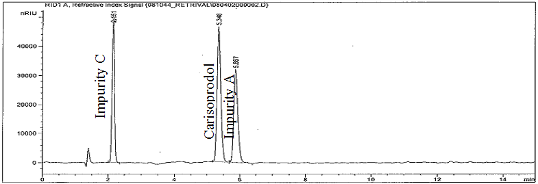 From the forced degradation studies, it was observed that carisoprodol was quickly degraded to impurity A in alcoholic alkaline media which was confirmed by injecting the carisoprodol impurity A CRS Lot no: 1a solution into chromatographic system, and resolution between carisoprodol peak and Impurity A obtained was 2.3. The RRT of impurity A was 1.1.