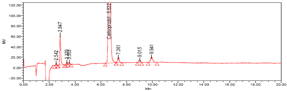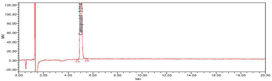 The present study was aimed to carry out by reversed-phase chromatography to determine Carisoprodol; the column used was Sunfire-C18 column (250 mm x 4.6 mm, 5 µm) at 30°C, mobile phase was prepared by mixing water with acetonitrile in the ratio 60:40v/v and refractive index detector at 30°C. The mobile phase was delivered at a flow rate of 1.0 ml per min. The mobile phase was filtered through a Millipore membrane filter paper and sonicated for 15 min for degassing prior to use.