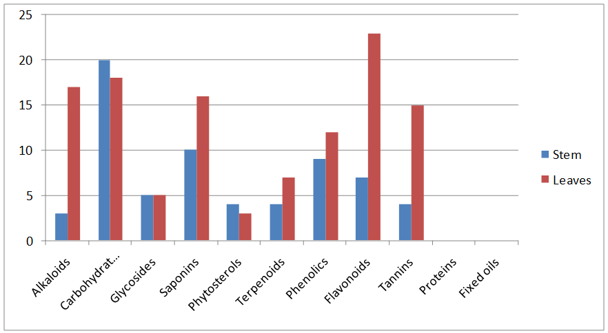 Both stem and leaves extracts were used for preliminary screening of phytochemicals such as alkaloids, carbohydrates, glycosides, saponins, proteins, phytosterols, tepenoids, fixed oils, phenolic compounds, flavonoids and tannins as shown in (table 1).