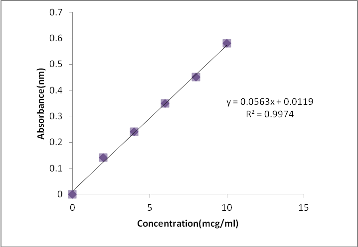A standard graph of pure drug in the concentration ranges of 2, 4, 6, 8, 10 µg/ml in the suitable medium was prepared and the graph was plotted by taking the concentrations on X-axis and absorbance on Y–axis.
