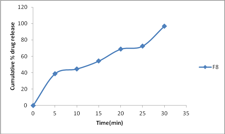 In vitro dissolution studies of the prepared fast disintegrating tablets was performed in pH 6.8 phosphate buffer using USP dissolution apparatus type 2. The dissolution rate was found to increase linearly with increasing concentration of superdisintegrant. Formulation F8 which contained crosspovidone have recorded drug release 96.94±0.47% at the end of 30 min.