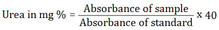 Urease splits urea into ammonia and carbon dioxide. Ammonia released in this reaction reacts with hypochlorite and phenolic chromogen to produce a green colour. The absorbance of this green colour at 578 nm. (570-620) is directly propotional to the concentration of urea in the specimen. The components of the assay mixture are Phosphate buffer; pH 7.0-35 mmol/l; Urease-15 KU/l; Phenolic Chromogen-2 mmol/l; Hypochlorite 4 mmol/l Activators and preservative. The sample volume taken was 0.01 ml and the reagent volume was 2.0 ml. The standard concentration was 40 mg %. 2.0 ml procedure was followed. Mixed and incubated the assay mixture at 37 °C for 5 min. After completion of incubation measured the absorbance of assay mixture against blank at 578 nm (570-620 nm).