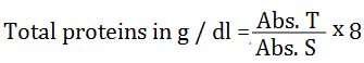 Proteins, in an alkaline medium, bind with the cupric ions present in the biuret reagent to form a blue-violet coloured complex. The intensity of the colour formed is directly proportional to the number of proteins present in the sample. The solutions contain Biuret reagent and Protein standard (8 mg/dl). The volume of the sample was 0.02 ml and that of standard protein was 0.02 ml. The wavelength of 550 nm was used. Mixed well and incubated at 37 °C for 10 min. measured the absorbance of the Standard (Abs. S), and Test Sample (Abs. T) against the Blank within 60 Min.