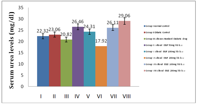 Fig. 2: Effect of Eriobotrya japonica fruits and seeds on serum urea levels in alloxan-induced diabetic rats