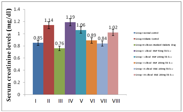 Fig. 3: Effect of Eriobotrya japonica fruits and seeds on serum creatinine levels in alloxan-induced diabetic rats