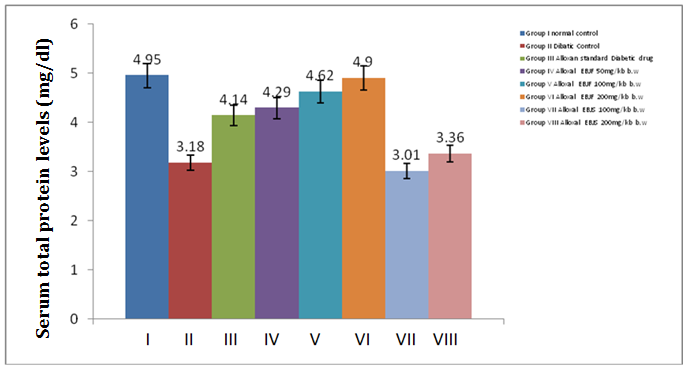 Fig. 4: Effect of Eriobotrya japonica fruits and seeds on serum total protein levels in alloxan-induced diabetic rats