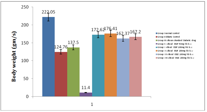 Fig. 5: Effect of Eriobotrya japonica fruits and seeds on body weight ( gms) in alloxan-induced diabetic rats