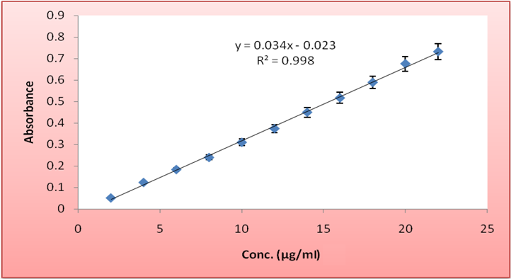 The absorbance of dilutions prepared above was measured at respective λ max found for each complex against methanol as a blank and recorded. The calibration curve was plotted using absorbance v/s concentration. Then the linear equation and regression coefficient were calculated.