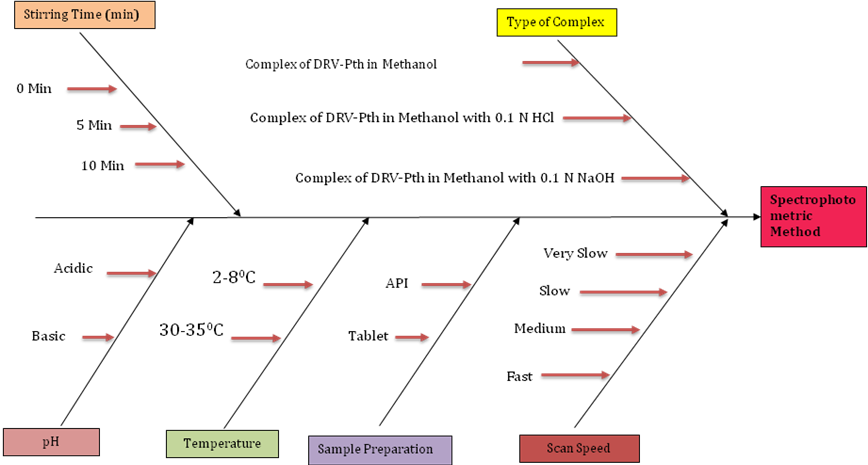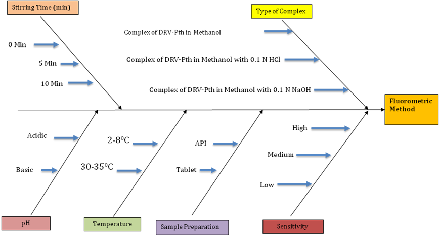 The critical parameter extracted for both methods were studied (table 6 and 7). The Ishikawa fishbone diagram for spectrophotometric and fluorometric methods was also studied (fig. 9 and 10).