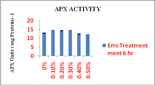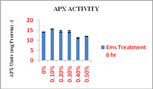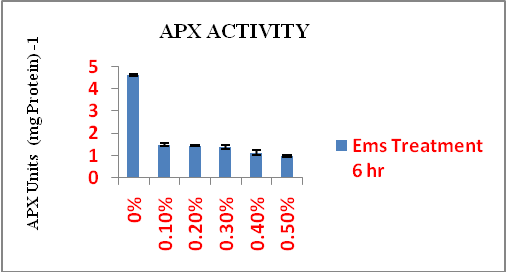 Fig. 1a: It shows the effect of ems with 6 h treatment on activity of ascorbate peroxidase (APX) in m1 generation wheat cultivar HD-2894: highest value obtained in 0%-4.63±0.032 Data represent the means±SD of three independent experiments