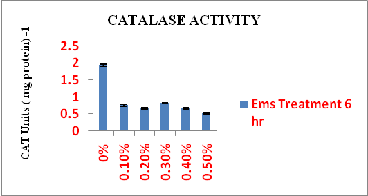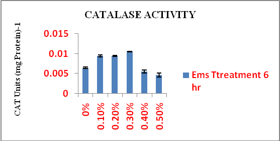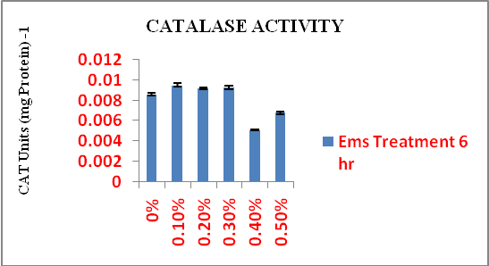 In the first generation observation of variety HD-2894 with 6 h exposure of ems, catalase (CAT) activity was found to be decreased with increased concentration of ems as compared to control (fig. 2a).