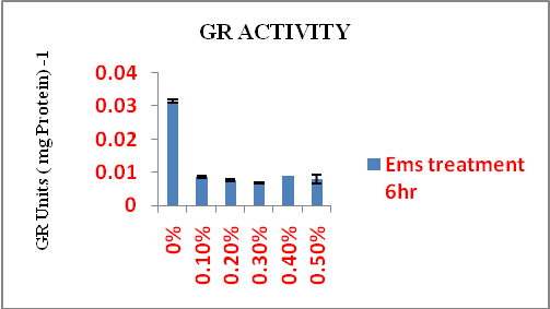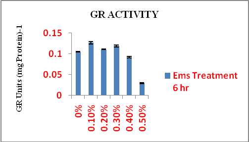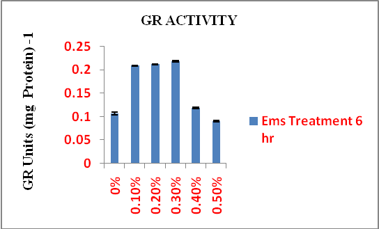 In the first generation observation of variety HD-2894 with 6 h exposure of ems mutagen, glutathione reductase (GR) activity was found to be reduced with increased concentration of mutagen as compared to control (fig. 3a).