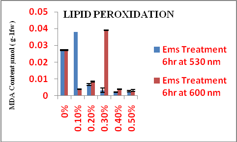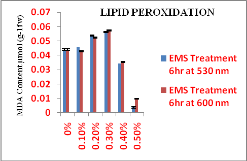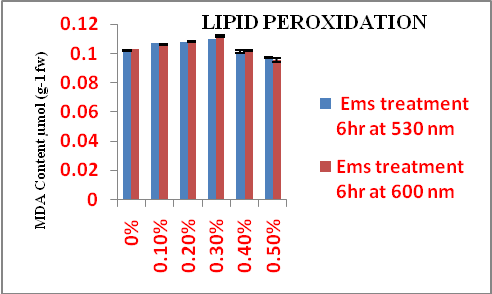 Fig. 4a: It shows the effect of ems with 6 h treatment on lipid peroxidation (LPO) content of m1 generation in wheat cultivar HD-2894: Highest value was recorded in the concentration of 0.1%-0.038±0.001 at 530 nm, 0.3%-0.00833±0.002 at 600 nm data represent the means±SD of three independent experiments