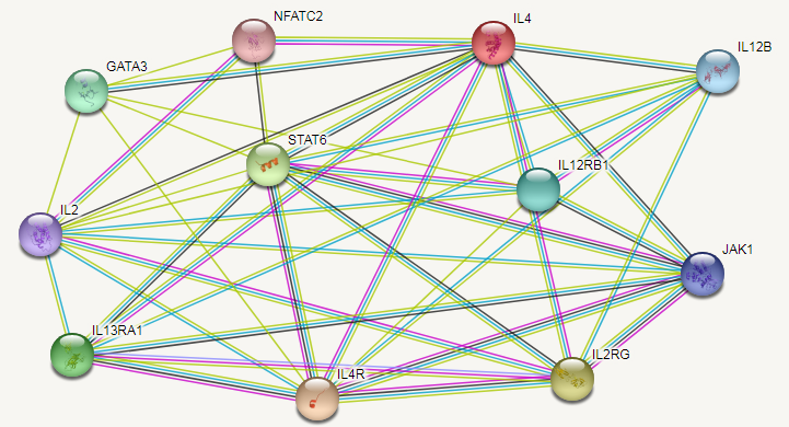 Involvement of neighboring genes of IL4 associated with asthma has been found out using the online bioinformatics tool, STRING. It has been found out that, there are 10 potential genes having significant interaction with the gene, IL4.