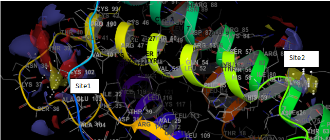 The protein obtained as a result of protein characterization studies was subjected to molecular docking studies using all the drug molecules obtained from environmental factor studies on IL4 gene and possible intermolecular interactions furnished by the drug-receptor association were also analyzed. Glide module of the molecular modeling software Schrodinger 2015-1 was used for the molecular docking studies. The protein preparation and energy minimization were done using the protein preparation wizard of the same software. During the preparation process, addition of hydrogen atoms, correction in terms of bond order was done. All the processes were done at a force field of OPLS_2005 at pH 7.4. The potential binding site in the protein crystal structure was assigned by the site map module of Schrodinger 2015-1 software. Site map consider the size, functionality requirement and the solvent exposure to the site and derive site score corresponding the site efficiency towards ligand binding. The site having maximum site score was selected for molecular docking and virtual screening processes.