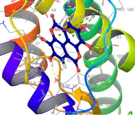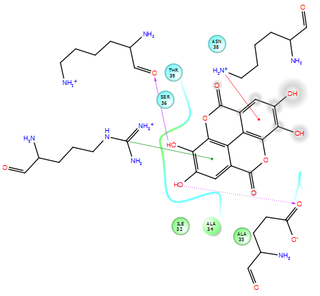 | Ellagic acid | -5.986 | -29.338 | ARG47, LYS37,LYS102, GLU103 | 2hydrogen bonding, 1 pi-pi stalking bonding, 1 pi-cation interactions | -27.883 |