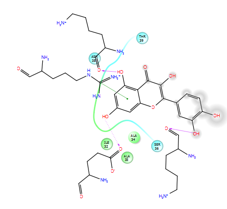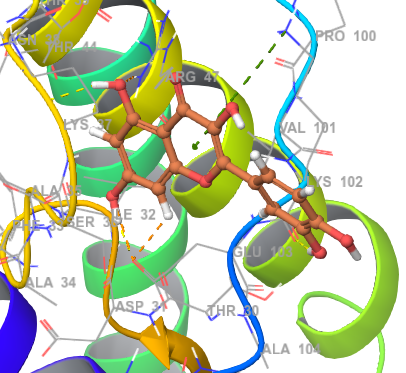 | Quercetin | -5.313 | -31.127 | LYS37, ARG47, GLU103, LYS102 | Three hydrogen bonding, one pi-pi stalking interactions | -26.651 |