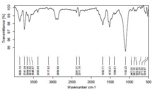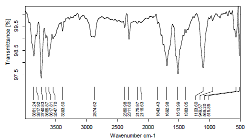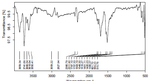 The IR analysis of the sample was carried out for qualitative compound identification. In ATR (Attenuated Total Reflectance), the solid material is placed onto the small crystal area. In this instrument IRAffinity-1, (Shimadzu, Japan) diamond being the preferred choice for most applications because of its robustness and durability [24]. After solid has been placed on the crystal area, the pressure arm is positioned over the crystal/sample area. Force is applied to the sample, pushing it onto the diamond surface. Transmittance was measured from wave number 4000 cm-1 to 400-1using Happ-Gensel apodization.