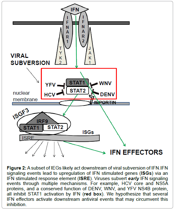 In general, IFNα can successfully inhibit the DENV if given preinfection, but not post-infection, and due to DENV mediated suppression of early members of the IFN signaling pathway, though some antiviral effect was observed in post-infection administration of PEGrIFN-alpha-2a, which significantly lowered daily viremia levels and improved virus clearance, in rhesus monkey. Defining where viruses block, or the host IFN response can inform design of antivirals that acsdownstream of that block. In preliminary studies, we have to identified 120 host antiviral candidates in a whole genome siRNA screen for HCV IEGs.