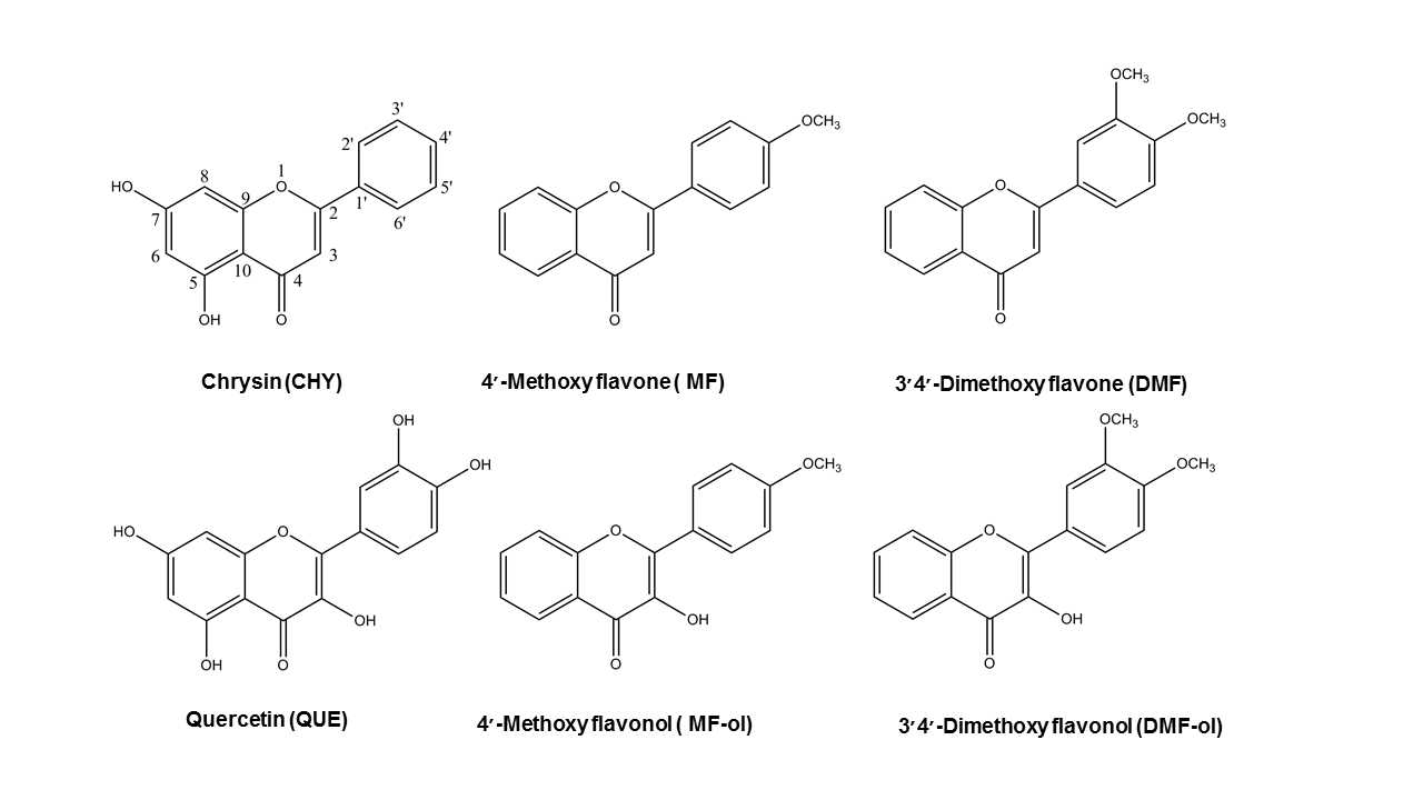 Fig. 1: Structure of Chrysin (CHY), 4´–Methoxyflavone (MF), 3´, 4´–Dimethoxyflavone (DMF), Quercetin (QUE), 4´–Methoxyflavonol (MF-ol), and 3´, 4´–Dimethoxyflavonol (DMF-ol)