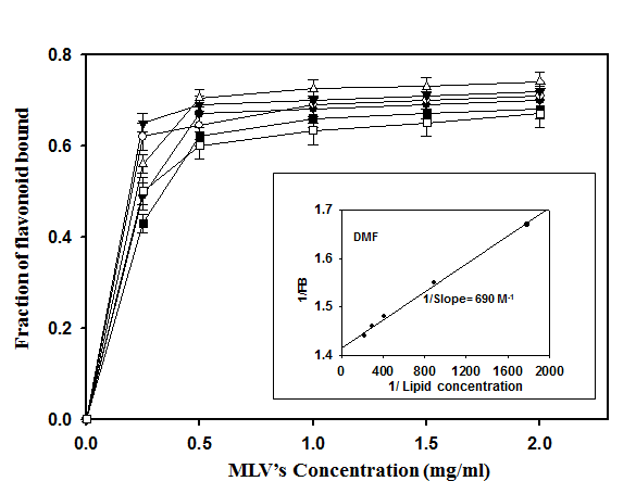 Fig. 2: Binding of CHY (●), MF (○), DMF (▼), QUE (Δ), MF-ol (■) and DMF-ol (□), with DPPC MLV’s. The fraction of drug bound (FB) has been determined by the centrifugation method, as described in the text. The inset fig. shows the double reciprocal plot for DMF