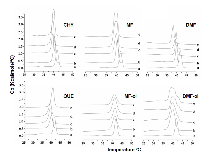 In case of CHY and QUE the Tm value decreases up to a concentration of 1:5 (CHY/QUE: lipid) molar ratio after which it increases. This can be explained by the tendency of QUE and CHY to form aggregates when in excess of their solubility in lipid bilayers [29].
