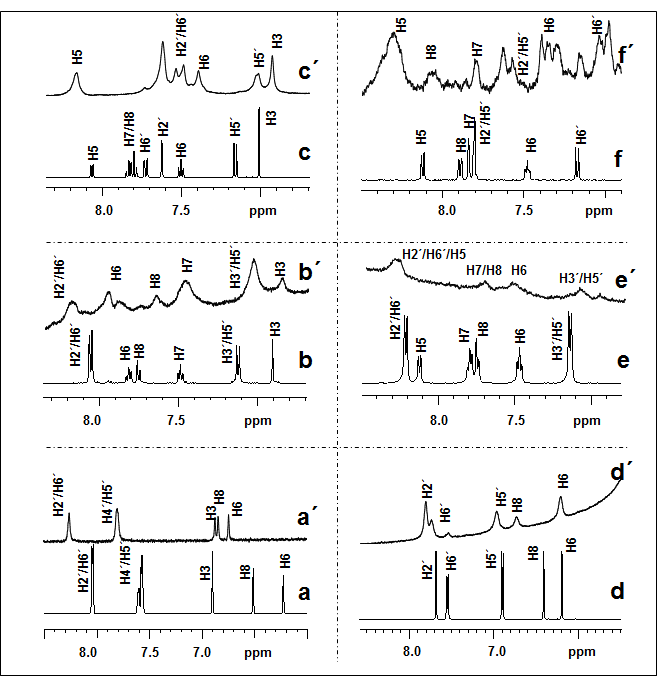 Fig. 4: 500.13 MHz 1H NMR spectra of aromatic region of pure CHY (a), MF (b), DMF (c), QUE (d), MF-ol (e) and DMF-ol (f) and that of ULV’s of DPPC incorporated with CHY (a´), MF (b´), DMF (c´), QUE (d´), MF-ol (e´) and DMF-ol (f´) in 1:5 drug: lipid molar ratio at 323K in D2O