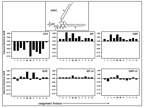 Fig. 5: Ring current induced chemical shift changes in the signals of ULV’s of DPPC incorporated with drugs in 1:5 drug/lipid molar ratio at 323K in the presence of CHY, MF, DMF, QUE, MF-ol and DMF-ol. Chemical shifts are either up–field (+) or downfield (–), depending on the orientation of the drug molecule with respect to the bilayer normal