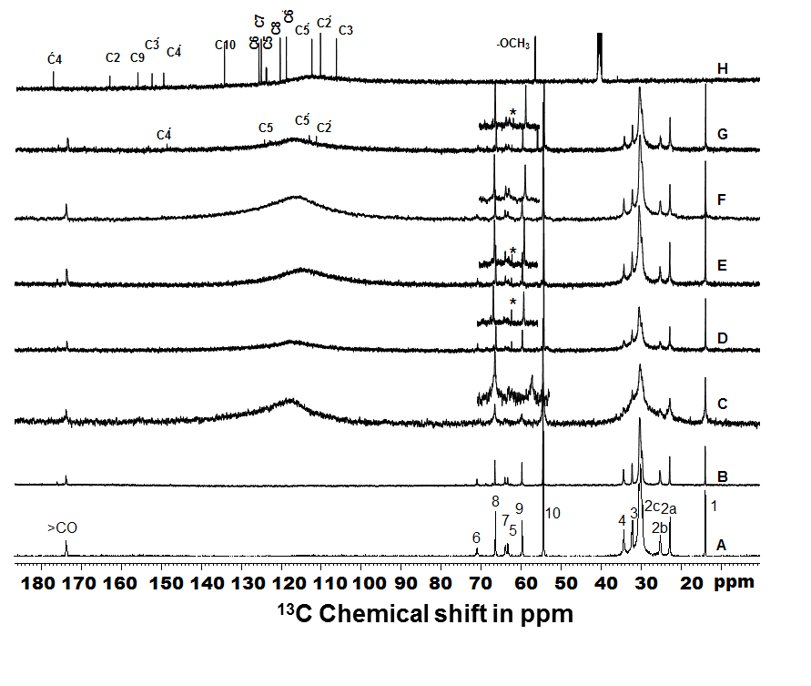 Fig. 6: 125.7 MHz 13C NMR spectra of DPPC ULV΄s (A) and ULV΄s of DPPC incorporated with CHY (B), MF (C), DMF (D), QUE (E), MF-ol (F) and DMF-ol (G) in 1:5 drug/lipid molar ratio at 323K in D2O. The 13C NMR spectrum of pure DMF-ol (H), in DMSO–d6 is also shown. Peaks for carbon atoms 5 and 7 have been vertically expanded to show upfield shift as indicated by*