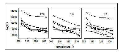 Fig. 7: Change in CSA (Hz) represented by Δσ=σ┴ − σ╨ with temperature at 1:10, 1:5 and 1:2 drug: lipid molar ratios. DPPC MLVs (●), CHY (○), MF (▼), DMF (Δ), QUE (■), MF-ol (□) and DMF (♦)
