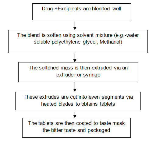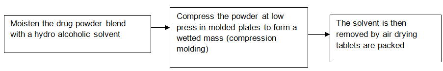 The molding process is of two types i.e. solvent method and heat method. FDT manufactured by the solvent method are less compact than compressed tablets and posses a porous structure that hastens dissolution. The mechanical strength of moulded tablets is a matter of great concern. Binding agents, which improve the mechanical strength of the tablets, need to be incorporated [23]. Masking of taste is an added problem to this technology and the masked drug particles are prepared by spray congealing a molten mixture of hydrogenated polyethylene glycol, cottonseed oil, lecithin, and sodium carbonate an active ingredient into a lactose-based tablet triturate form. Tablets produced by the moulding technique are easy to scale up for the industrial manufacturer, compared to the lyophillisation technique.