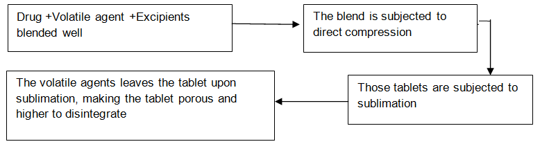 Incorporation of volatile ingredients to generate a porous mixture is subjected to a process of sublimation. Highly volatile ingredients like benzoic acid, ammonium bicarbonate, ammonium carbonate, camphor, naphthalene, urea, phthalic anhydride and urethane may be compressed along with other excipients into a tablet. With help of process of sublimation, this volatile material is then removed, leaving behind a highly porous matrix. Tablets manufactured by this technique have reported to usually disintegrate within 10-20 sec. Solvents like benzene; cyclohexane can be used as pore-forming agents [25].