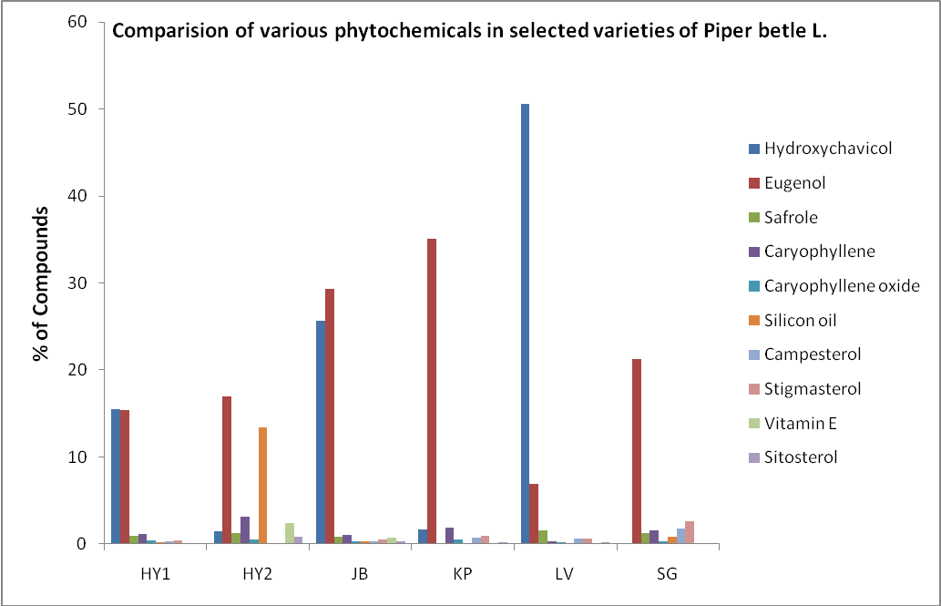 In the present study, ten major chemicals were identified and compared. Among the chemical compounds, the major component is Eugenol, which is responsible for flavour and aroma of the leaves. Variety Karpoori possesses the highest content of Eugenol and could be used as a promising variety in the pharmaceutical industry. The components of essential oil can also serve as a determinant to distinguish different varieties of betle vine cultivars.