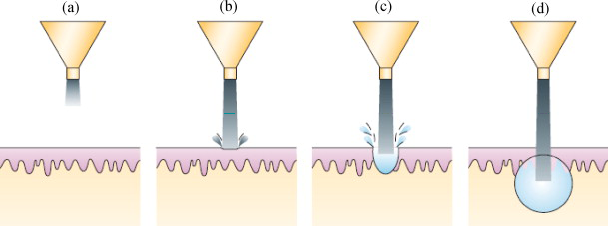 The basic principle of injection is “if a high enough pressure is generated by a fluid in intimate contact with the skin, then the liquid will punch a hole into the skin and be delivered into the tissues in and under the skin.” Although the same principle is applied as in powder, there is a difference in the actual design and operation of the powder injection devices. These systems use gas or spring, pistons, drug-loaded compartments and nozzles. Typically, the nozzle has an orifice size of about 150 to 300 μm [12]