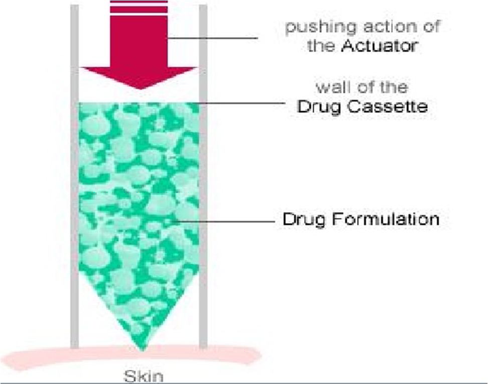 These injections consist of a chamber filled with solid drug content and a nozzle for firing drug particles into the skin by utilizing the power source which typically is compressed gas. The injection has a diaphragm (a few microns thick) on either side of the chamber to cover the drug chamber [9].