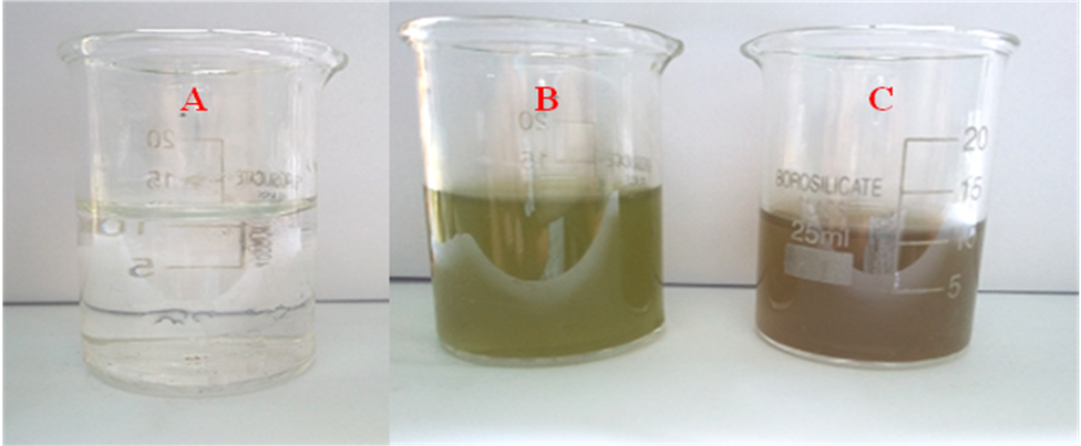 Fig. 1A: Color intensity of 1 mmol AgNO3 solution, B. Aqueous extract of Carica papaya (pale light green colour), C. AgNPs synthesized at different hours with pale light green colour to dark brown colour