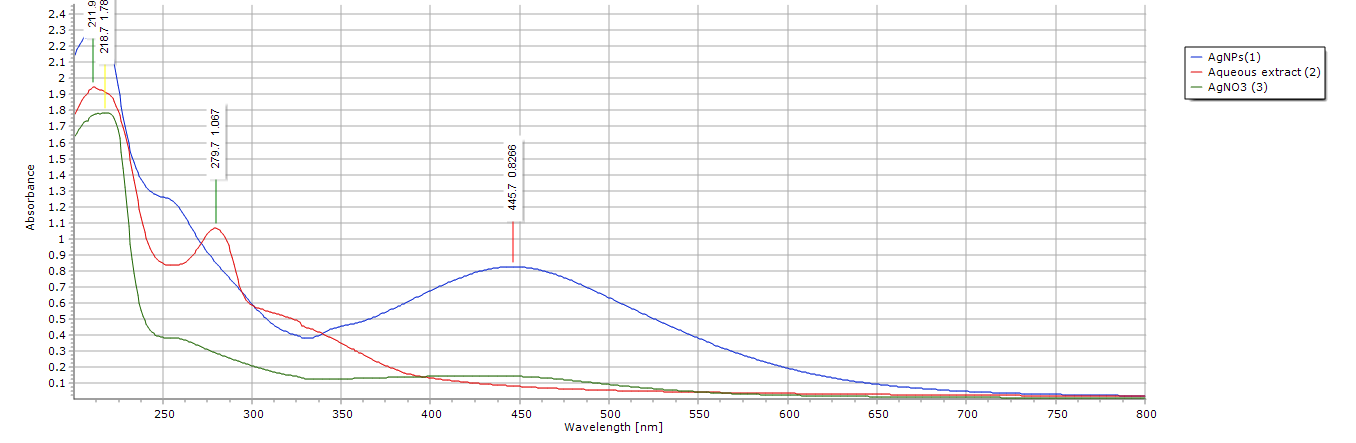 The UV-visible spectral analysis of (Carica papaya) without AgNO3 did not show any change in colour. The UV-vis spectra of all the samples exhibited distinct surface plasmon resonance bands. The position of plasmon resonance band in UV-vis spectra is sensitive to particle shape, size, its interaction with the medium and the extent of charge transfer between medium and the particles. Here, the sharp bands were centered at 445.7 nm in (Carica papaya) AgNPs extract clearly indicate the presence of silver nanoparticles (fig. 2). Similarly, AgNPs synthesized by using aqueous extract of Sargassum polycystum showed absorbance at 430 nm [35], Sargassum longifolium showed absorbance peak at 460 nm [36], Eucalyptus hybrid [37], Acalypha indica [38], Solanum tarvum [39], Helianthus annus [40], and Cassia auriculata [41], the absorbance peaks were between 400 and 450 nm. When compared with these plants and seaweeds, AgNPs synthesized from an aqueous extract of Carica papaya were active at the relatively lower wavelength.